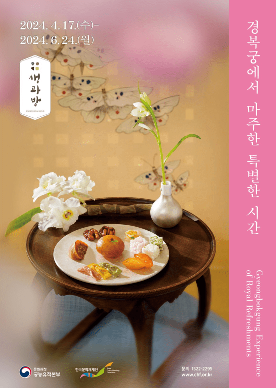 경복궁 생과방 체험을 4월 17일(수) - 6월 24일(월)에 할 수 있습니다. 100% 사전예약제로 운영되며, 별도의 현장 판매는 진행되지 않습니다.