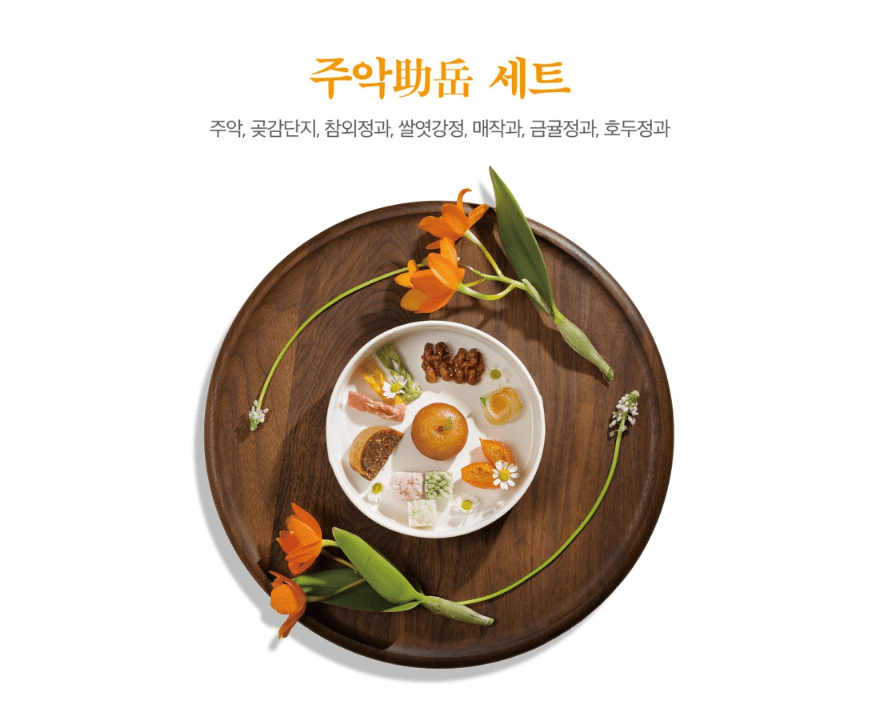 - 호두정과(호두, 설탕) : 알이 굵고 단단한 호두를 골라 꿀을 넣어 조린 뒤 노릇하게 튀겨내 고소한 맛이 나는 전통과자입니다. 각종 영양이 가득하여 건강에 좋을 뿐 아니라, 두뇌 건강과 피부에 좋다고 알려져 있습니다. 식감이 바삭하고 달콤해 남녀 모두가 좋아하는 별식입니다.