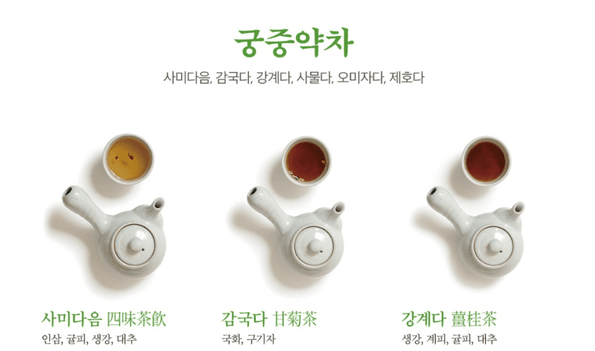 - 사미다음(인삼, 귤피, 생강, 대추) : 몸을 보하는 인삼과 기의 순환을 돕는 귤피, 몸을 따뜻하게 하는 생강을 사용하여 만든 약차입니다. 조선왕조실록에는 한기가 엄습한 추운 겨울, 당시 어의였던 허준이 선조 임금의 몸을 보하기 위해 만들어 올린 약차로 기록되어 있습니다.